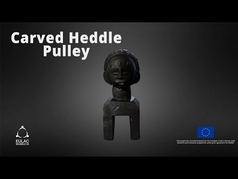 It was common for men to do weaving in West African countries. By means of heddle pulleys the weavers separate the warp threads into ‘fans’ by means of foot pedals. Then the weft threads are ‘shot through’ these ‘fans’. Thus, fabric is created. These heddle pulleys were often carved, and with this one, a face can be made out on one of the sides. Often the faces were of goddesses, so the weavers could look at beauty while they work. Baule peoples and their neighbors to the West, the Guro, are famous as weavers, and are known for their fine indigo-and-white cotton fabrics. Scholars have suggested that the prominent display of pulleys, hanging over the weaver’s loom in the public place, afforded artists their best opportunity to showcase their carving skills, in the hope to attract commissions for figures and masks. This figurative pulley with carved a head demonstrates the efforts put by Baule and Guro artists into beautifying the simplest functional object.